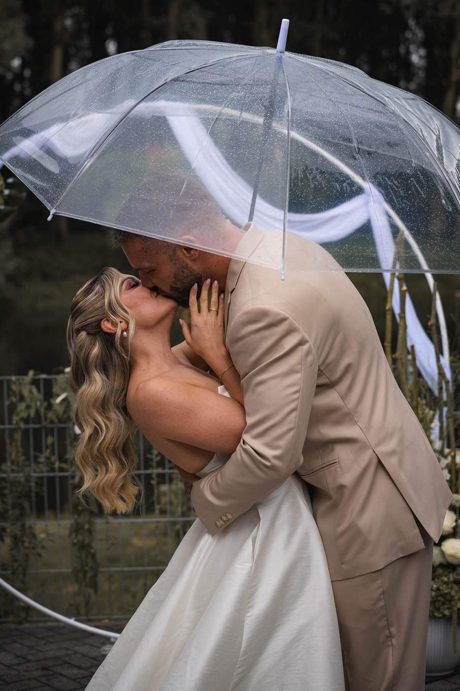 Bei Hochzeiten habe ich einen großen transparenten Regenschirm für euch dabei, der auf Bildern ganz zauberhaft aussieht. Regen muss nicht zwangsläufig bedeuten, dass eure Fotos „ins Wasser fallen“, im Gegenteil: Er kann euren Bildern einen ganz besonderen Look verleihen. Im Notfall können wir aber auch auf ein After-Wedding-Shooting ausweichen.