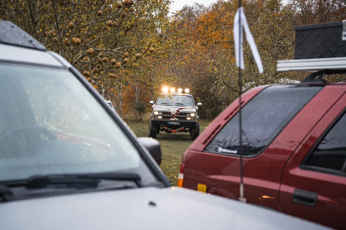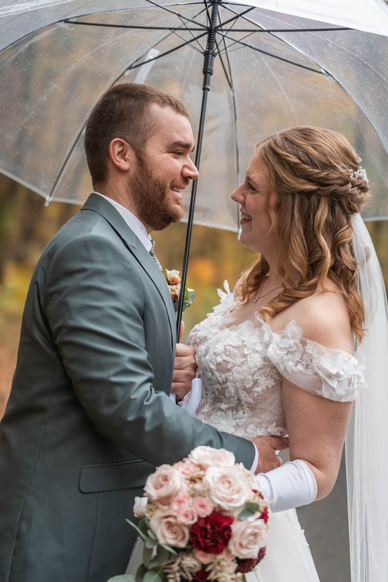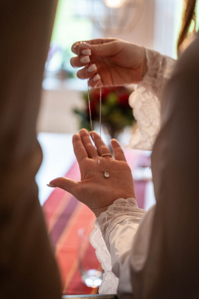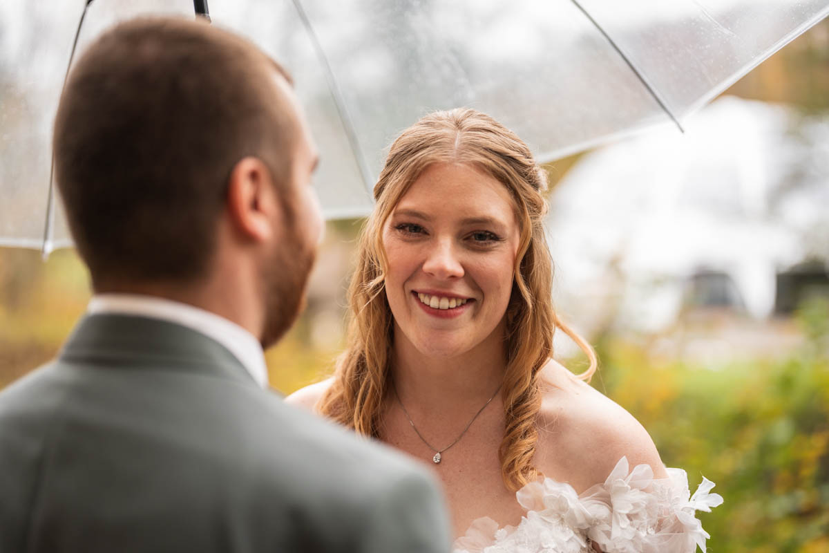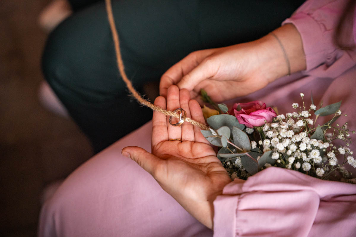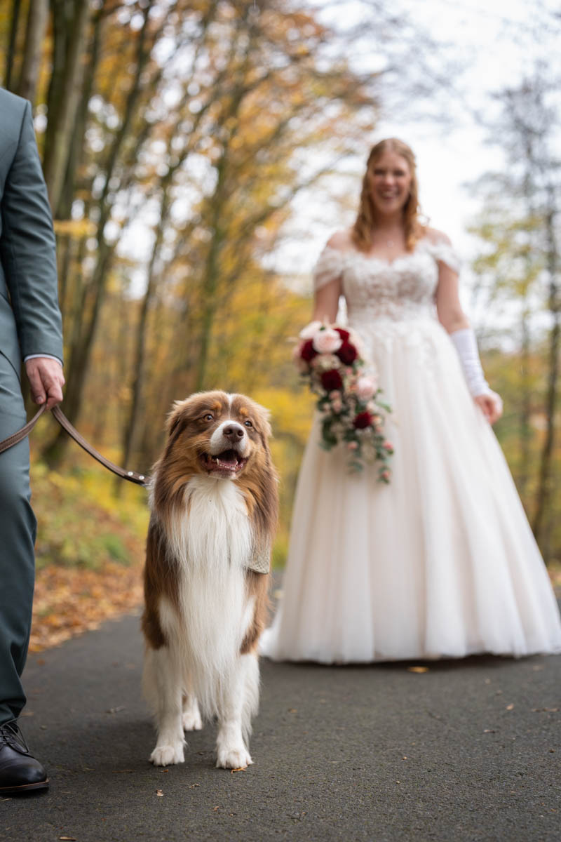 Schon beim Getting Ready war die Stimmung ausgelassen und entspannt. Für das Brautpaarshooting fuhren wir anschließend in den nahegelegenen Wald, wo auch der Regen für kurze Zeit gnädig mit uns war. Für die kurzen Schauer zwischendurch hatte ich einen durchsichtigen Regenschirm dabei, der sich wunderbar auf Fotos macht. Besonders toll: Mambo, der süße Hund des Brautpaares, war beim Fotoshooting und bei der Trauung als Ringträger dabei. Die Hochzeit war gespickt von kleinen liebevollen Aufmerksamkeiten der Gäste und ausgefallenen Programmpunkten - vom extraordinären Auftritt des Bräutigams im James Bond Stil bis zur Hochzeitspizza mit Feuerwerk am Abend. Abgerundet wurde die Hochzeitsreportage durch ein weiteres Brautpaarshooting in der Dunkelheit. Highlight waren hierbei die Lichter der Geländewagen des Bräutigams und dessen Freunde, und der strömende Regen gab den Bildern nochmal einen besonderen Touch.